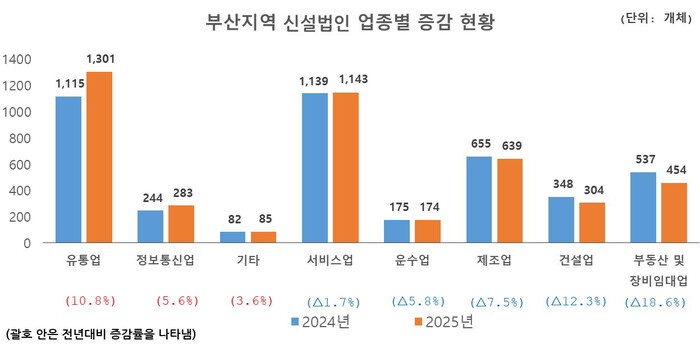 조사결과에 따르면, 지난해 부산지역 신설법인은 4,383개체로 전년대비 2.0% 증가했다. 2021년 6,779개체로 최고치를 기록한 이후 3년간 신설법인 수가 감소하였으나, 2025년 하락세를 뒤로하고 소폭 증가하면서 창업시장 회복에 대한 기대감을 높였다. 이는 내수 여건이 점진적으로 개선된 가운데 유통업과 정보통신업 등 일부 경기호전 업종을 중심으로 한 창업 수요 회복이 복합적으로 작용한 것으로 분석된다.