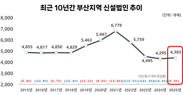 2025년 신설법인 4,383개체로 전년대비 2.0% 늘어