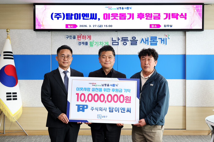 [인천=문찬식 기자] 인천 남동구는 지난 27일 주식회사 탑이엔씨(대표 조은호)로부터 지역사회의 어려운 이웃을 돕기 위한 성금 1천만 원을 기탁받았다고 밝혔다.