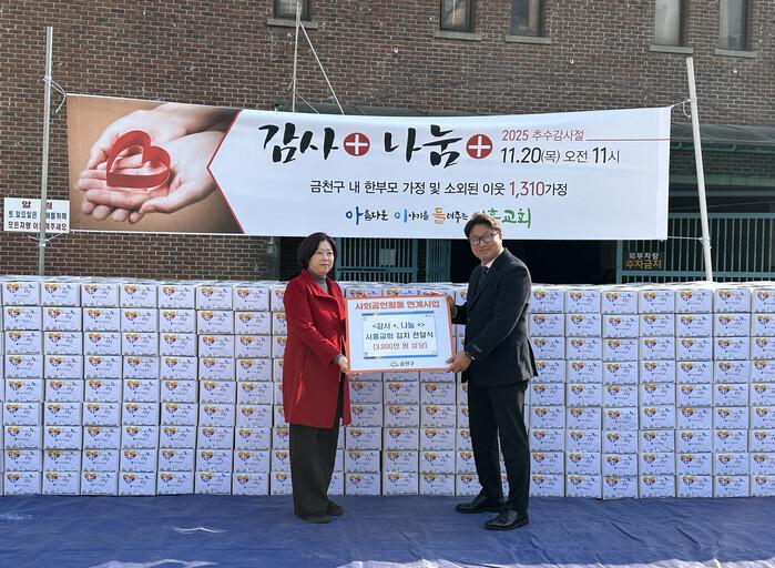 [시민일보 = 여영준 기자] 금천구(구청장 유성훈)는 지난 20일 시흥교회(담임목사 김형일)가 관내 취약계층에게 3000만 원 상당 김치를 후원했다고 밝혔다.