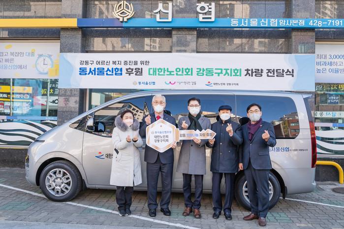 서울 강동구가 최근 동서울신협으로부터 11인승 승합차량 1대를 기부받았다. 기부받은 차량은 스타리아 승합차량으로 앞으로 대한노인회 강동구지회에서 경로당 운영지원 및 노인일자리사업 수행 등을 위한 업무용 차량으로 사용될 예정이다. 사진은 전달식에서 이정훈 구청장(가운데)과 관계자들이 기념촬영을 하는 모습. (사진제공=강동구청)