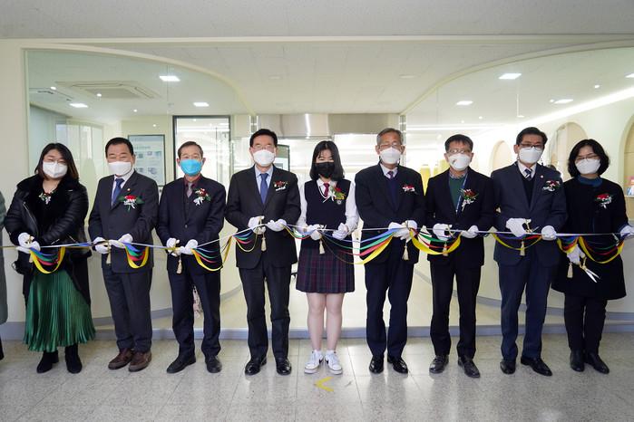 유덕열 서울 동대문구청장이 최근 4차산업 핵심 역량 교육의 거점 센터로 조성된 장평중학교 메이커 스페이스 ‘이룸’ 개관식에 참석했다. 사진은 개관식에서 유 구청장(왼쪽 네 번째)이 관계자들과 테이프 커팅을 하는 모습. (사진제공=동대문구청)