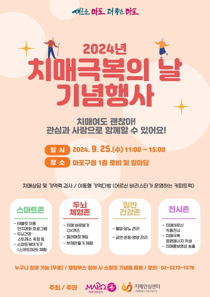 이번 행사는 지역 주민 누구나 무료로 참여할 수 있으며, 자세한 사항은 마포구치매안심센터로 문의하면 안내 받을 수 있다.