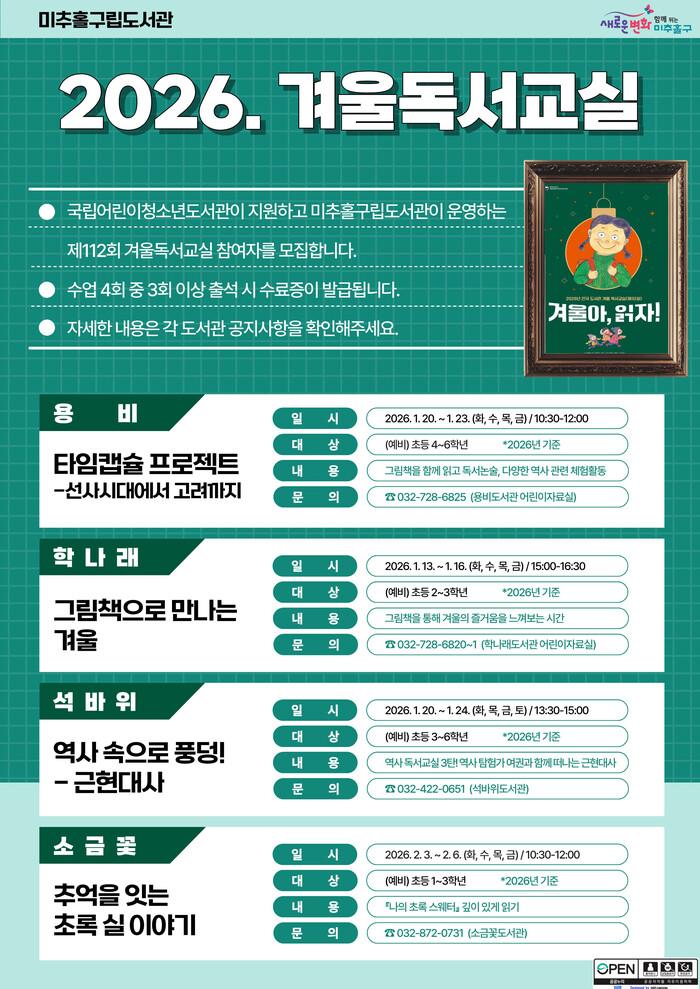 [인천=문찬식 기자] 인천 미추홀구(구청장 이영훈) 구립도서관은 2026년 겨울방학을 맞아 관내 어린이를 대상으로 ‘겨울 독서 교실’과 ‘겨울방학 특강’을 운영한다고 밝혔다.