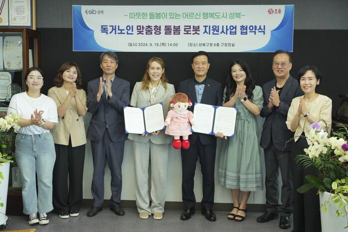| ▲ 지난 19일 돌봄 로봇 지원사업 협약식에 참석한 이승로 구청장(왼쪽에서 다섯 번째)과 관계자들이 기념촬영을 하고 있다. (사진=성북구청제공) |