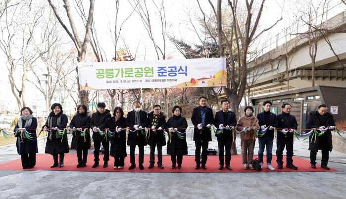 오승록 서울 노원구청장이 공릉가로공원에서 진행된 '공릉가로공원 정비사업' 준공식에 참석했다. 이번 공원 정비를 통해 ▲스마트쉼터 설치 ▲가로노점 정비 ▲이끼정원 조성 ▲진입로 2곳 추가설치 ▲휴게시설 확충 ▲광장마루 및 수경시설 조성 등 다양한 시설이 새롭게 단장됐다. 사진은 오 구청장(오른쪽 여섯 번째)이 테이프커팅식을 진행하는 모습. (사진=노원구청 제공)