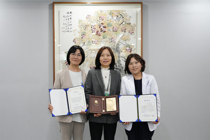 | ▲ 사진=왼쪽부터 51병동 안윤경 과장(성남시간호사 회장상 수상), 고객만족실 서예숙 팀장(성남시장상 수상), 이원희 과장(경기도병원간호사회 회장상 수상) |
