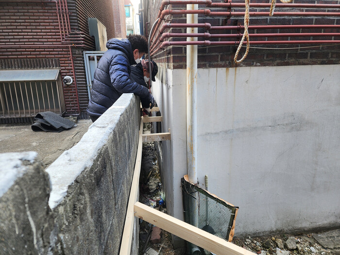 집수리 봉사활동에는 전국인테리어목수 사회적협동조합 소속의 전문 기술을 보유한 봉사단체가 참여해 노후 담벼락의 상태를 점검하고, 임시로 구조 보강을 위한 버팀목을 설치해 안전성을 높였다.