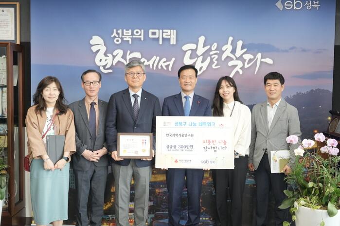 | ▲ 이승로 성북구청장(오른쪽에서 세번째)과 오상록 한국과학기술연구원장(왼쪽에서 세 번째) 그리고 한국과학기술연구원 직원들이 함께 기념사진을 찍고 있다. (사진=성북구청 제공) |