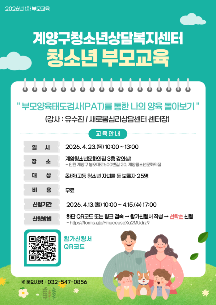 [인천=문찬식 기자] 인천 계양구청소년상담복지센터(센터장 김기찬)는 초·중·고등학생 청소년 보호자를 대상으로 부모양육태도검사(PAT)를 활용한 ‘나의 양육 돌아보기’ 부모교육 프로그램을 운영한다고 밝혔다.