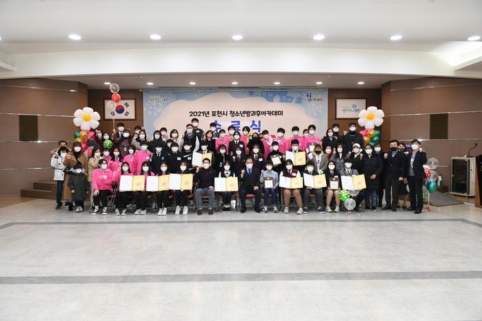 경기 포천시청소년교육문화센터와 포천청소년문화의집에서 운영하는 청소년방과후아카데미가 최근 ‘2021년 포천시 청소년방과후아카데미 수료식’을 개최했다. 수료식에서는 활동 영상과 수어 공연, 합창 영상 등을 시청했으며, 청소년들의 작품 전시회도 마련했다. 사진은 이날 수료식에 참석한 박윤국 시장과 학생들이 기념촬영을 하고 있는 모습. (사진제공=포천시청)