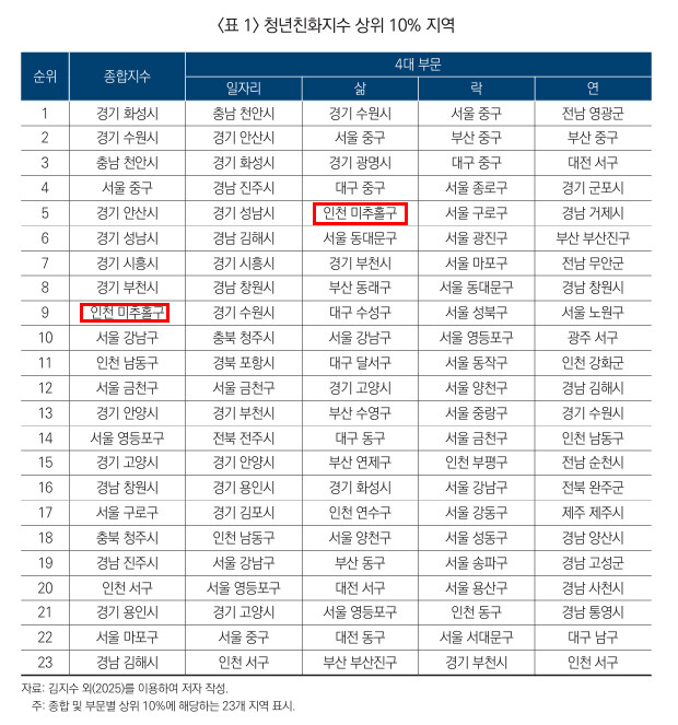 산업연구원이 발표한 ‘청년의 지역 이동과 정착: 일-삶-락-연 기반의 청년 친화 지수 정책 방향’ 보고서에 따르면, 미추홀구는 전국 229개 시군구 중 종합 9위(상위 10%)를 차지했다.