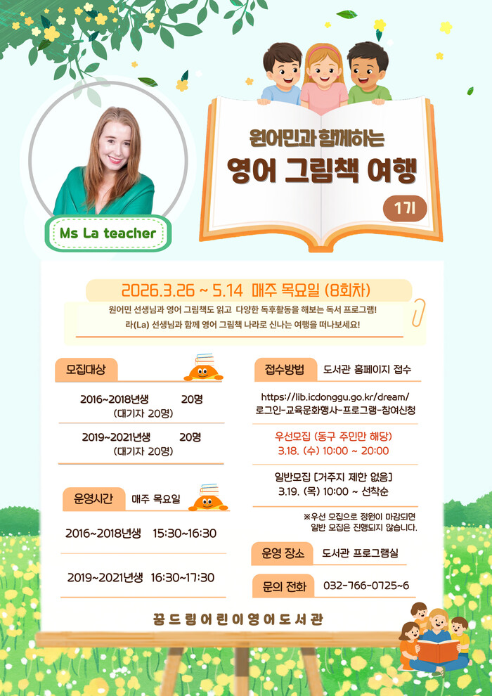 [인천=문찬식 기자] 인천 동구(구청장 김찬진)는 꿈드림어린이영어도서관에서 오는 18일부터 ‘원어민과 함께하는 영어 그림책 여행(1기)’ 수강생을 선착순으로 40명 모집한다고 밝혔다.