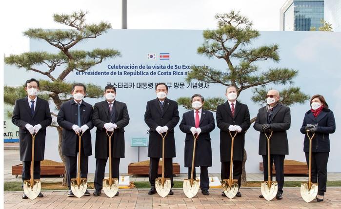 서울 마포구는 최근 상암동 ‘코스타리카 광장’에서 카를로스 알바라도 코스타리카 대통령을 환영하는 행사를 진행했다. 이날 참여자들은 코스타리카와 마포구 간 우호 협력을 기원하는 조형 소나무를 식재했다. 사진은 기념 식수에 앞서 유동균 구청장(왼쪽 네 번째)과 알바라도 대통령(왼쪽 세 번째)이 기념촬영을 하는 모습. (사진제공=마포구청)