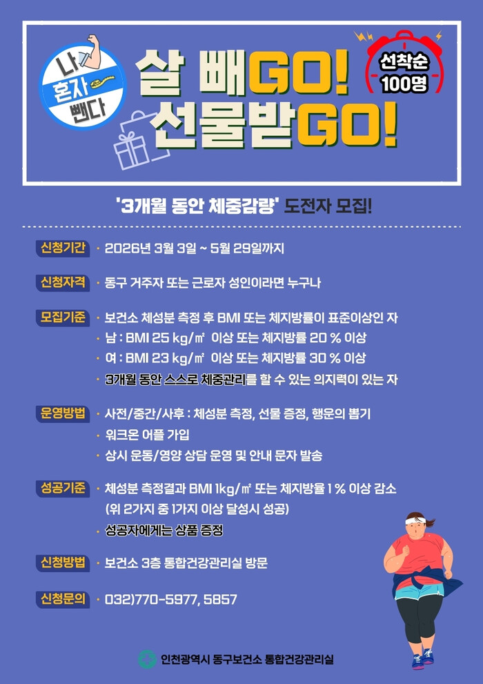 [인천=문찬식 기자] 인천 동구보건소(소장 임미숙)는 주민 스스로 건강한 체중 관리를 할 수 있도록 돕는‘나 혼자 뺀다! 살빼GO! 선물받GO!’프로그램 참여자를 모집한다고 밝혔다.