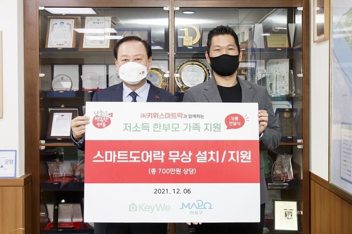 서울 마포구는 6일 (주)키위 스마트락으로부터 스마트도어락 32개(총 700만원 상당)를 전달받았다. 이 스마트도어락은 집에 아이 혼자 있는 시간이 많은 저소득층 한부모가족 32가구에 (주)키위 스마트락이 직접 무상으로 설치할 예정이다. 사진은 전달식에서 유동균 구청장(왼쪽)이 김도현 대표와 기념촬영을 하는 모습. (사진제공=마포구청)