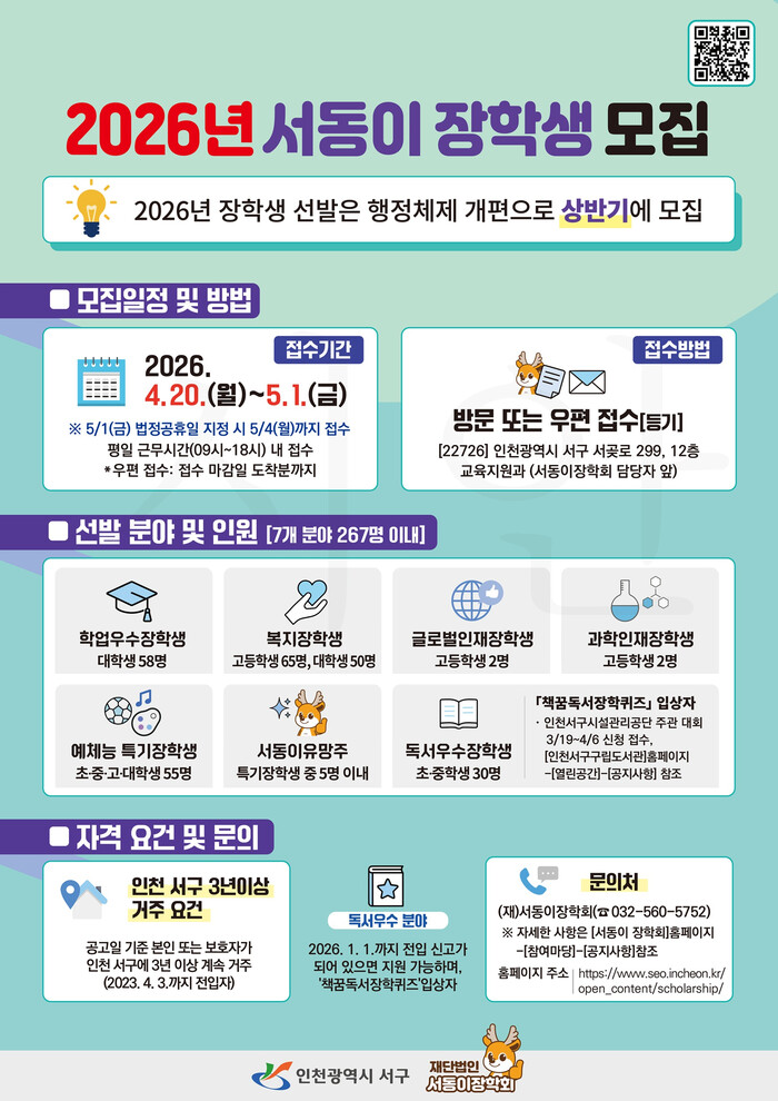 [인천=문찬식 기자] 인천 서구 재단법인 서동이장학회(이사장: 강범석 서구청장)는 지역 인재 양성을 위한 ‘2026년도 서동이 장학생’을 상반기에 모집한다.