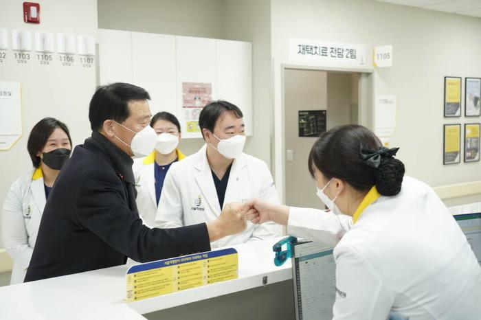 이승로 서울 성북구청장은 3일 코로나19 재택치료 관리자를 격려하기 위해 재택치료전담반과 구 협력기관인 서울척병원, 성북우리아이들병원을 방문해 의료진 및 관계자들을 응원했다. 사진은 이 구청장(앞쪽 왼쪽)이 서울척병원에서 의료진들과 인사를 나누고 있는 모습. (사진제공=성북구청)