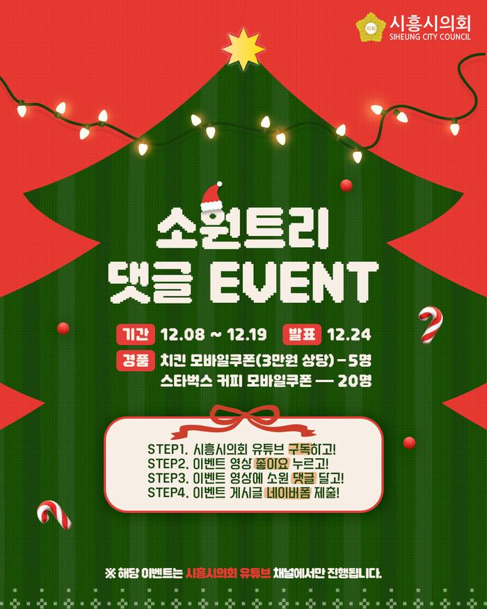 [시흥=송윤근 기자] 경기 시흥시의회(의장 오인열)가 다가오는 성탄절을 맞아 시민들과 따뜻한 마음을 나누고 소통을 강화하기 위해 ‘소원트리 댓글 이벤트’를 진행한다.