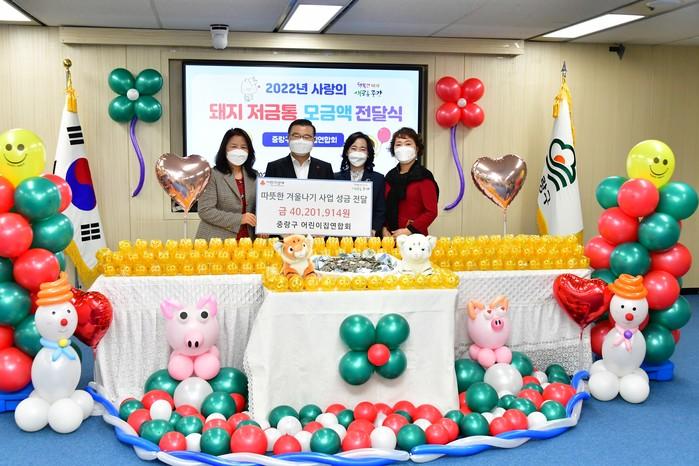 서울 중랑구는 최근 184개 국공립·민간·가정 어린이집 원아들이 1년 동안 모은 ‘사랑의 돼지 저금통’ 모금액 약 4000만원을 중랑구 어린이집연합회로부터 '2022 따뜻한 겨울나기 성금'으로 전달받았다. 모금액은 지역 저소득·다문화 가정의 어린이들을 위해 쓰일 예정이다. 사진은 전달식에서 류경기 구청장(왼쪽 두 번째)과 관계자들이 기념촬영을 하는 모습. (사진제공=중랑구청)