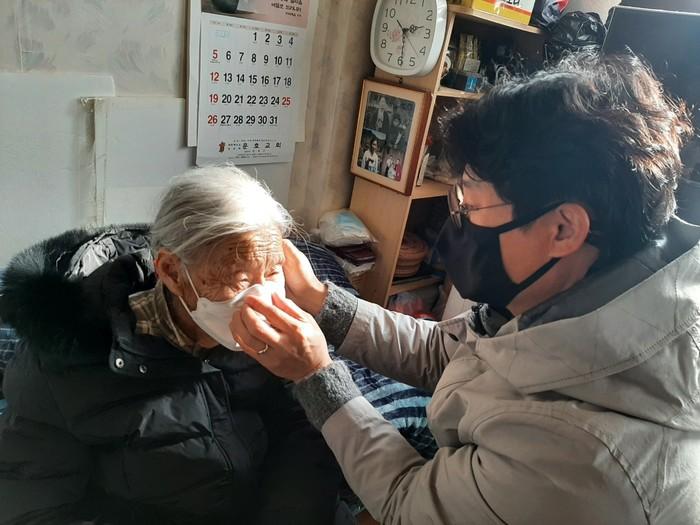 YP아트스쿨 빨간약 봉사동아리는 최근 경기 양평군 서종면 복지 위기가구 2가정을 방문해 동절기 이불 및 코트와 마스크 등을 전달하며 이웃에 따뜻한 온기를 전했다. 사진은 대상가구를 방문한 동아리 관계자가 할머니에게 마스크를 씌워주고 있는 모습. (사진제공=양평군청)