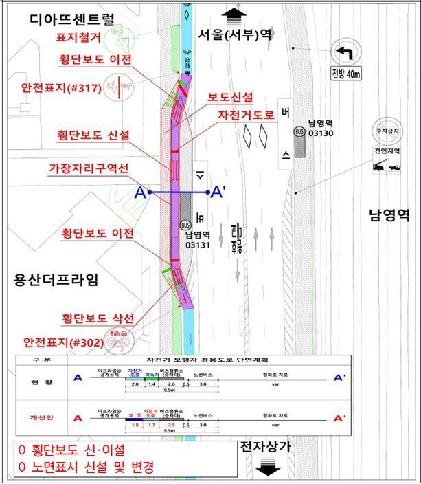6일 구에 따르면 공사 구간은 남영역 1번 출구 인근 버스정류소(남영역, 03131) 일대로, 그동안 이 구간은 인근 공동주택(용산더프라임) 보행경로와 접해 자전거 도로가 위치해 있어 공동주택 주민이 보도를 접근하기 위해서는 반드시 자전거 도로를 경유해야 한다.