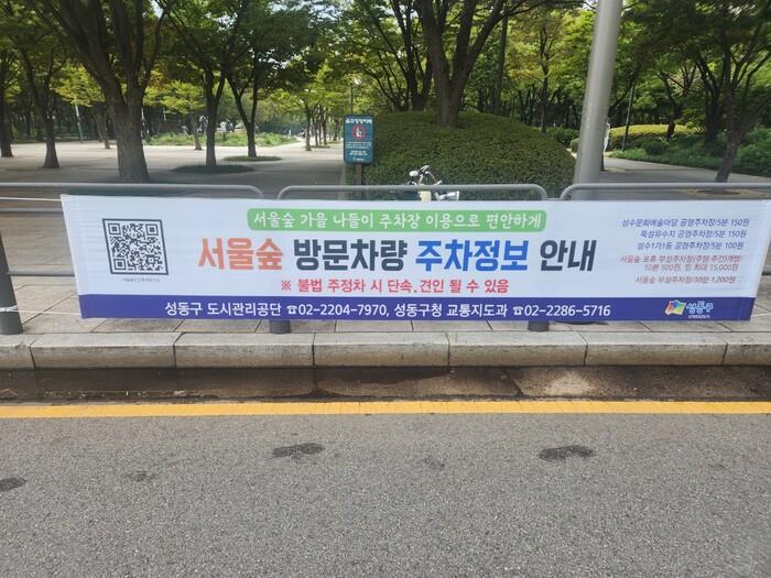 | ▲ 서울숲 공영주차장 안내 현수막. (사진=성동구청 제공) |