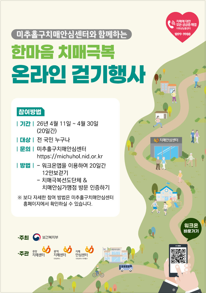 [인천=문찬식 기자] 인천 미추홀구보건소(소장 차남희, 이하 보건소)가 걷기 좋은 봄철을 맞아 오는 11일부터 30일까지 치매 예방을 위한 ‘2026 한마음 치매 극복 온라인 걷기 행사’를 개최한다.