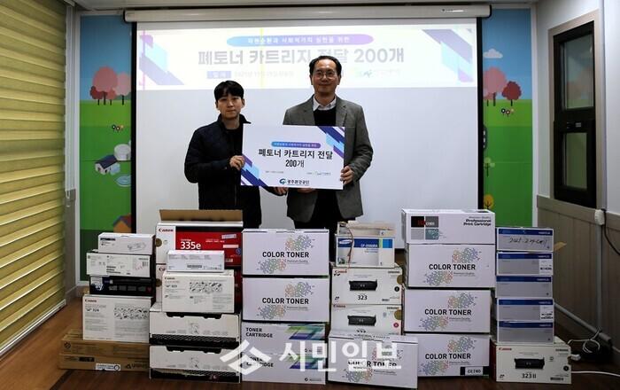 | ▲ 광주환경공단, 25일 다목적회의실에서 사회복지법인 (사)가나안근로복지관에 폐토너 카트리지 200개 기부 기념촬영 / 광주환경공단 제공 |