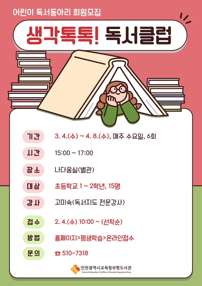 [인천=문찬식 기자] 인천광역시교육청부평도서관(관장 김재영)은 3월 4일부터 4월 8일까지 2026년 상반기 어린이 독서동아리 ‘생각 톡톡! 독서클럽’을 운영한다.