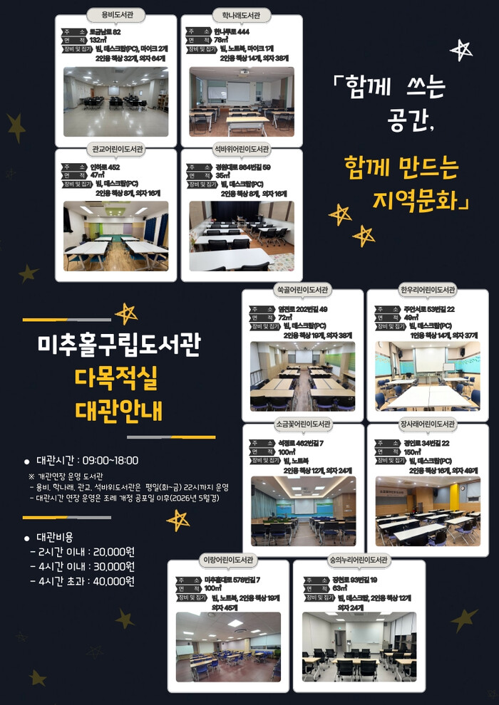 [인천=문찬식 기자] 인천 미추홀구(구청장 이영훈)가 주민들의 문화 활동과 커뮤니티 활성화를 위해 구립도서관 다목적실 대관 운영을 확대한다.
