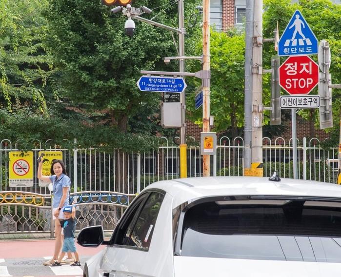 | ▲ 지난 16일 주민이 아이와 함께 한강초등학교 앞 어린이 보호구역 무신호 횡단보도를 지나고 있다. (사진제공=용산구청) |