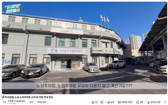 [인천=문찬식 기자] 인천 미추홀구시설관리공단(이사장 박종구, 이하 공단)은 지난 26일 공영주차장 이용객의 편의를 높이고 혼란을 방지하고자 ‘노상·노외주차장 이용 안내 홍보 영상’을 제작해 배포했다.