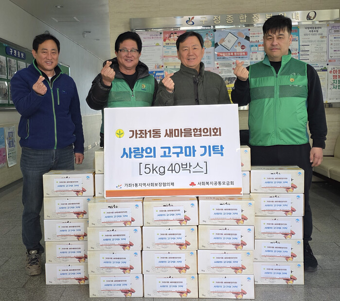 [인천=문찬식 기자] 인천 서구 가좌1동 새마을협의회(회장 권영민)는 지역 어르신들과 이웃들을 돕기 위해 고구마 40상자(5kg)를 기탁하며 지역사회에 온정을 전했다. 이번 나눔은 지역사회에 따뜻한 정을 전하고자 도움이 되기를 바라는 마음에서 마련됐다.