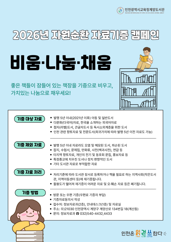 [인천=문찬식 기자] 인천광역시교육청계양도서관(관장 황선주)은 시민과 지역사회가 함께하는 자원순환형 독서문화 확산을 위해 2026년 자료기증 캠페인 ‘비움·나눔·채움’을 연중 운영한다고 5일 밝혔다.