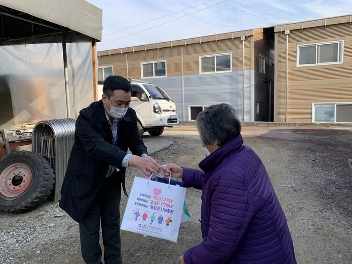 경기 광주시 초월읍 행정복지센터는 29일 지역내 폐지를 줍는 노인 5명을 대상으로 동절기 안전사고 예방을 위한 교육을 실시하고 방한점퍼 등 방한용품 및 방역용품을 전달했다. 사진은 센터 관계자가 대상 노인에게 방한용품 등을 전달하고 있는 모습. (사진제공=광주시청)