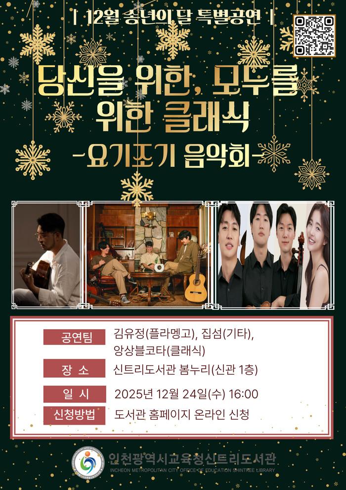 [인천=문찬식 기자] 인천광역시교육청신트리도서관(관장 정경애)은 오는 24일 오후 4시 신관 1층 봄누리에서 ‘당신을 위한, 모두를 위한 클래식’ 공연을 개최한다.