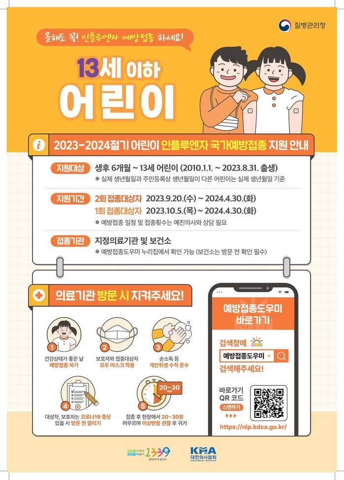 오는 9월 20일부터 실시하는 어린이 2회 접종 대상자는 생후 6개월부터 만 9세 미만 중 생후 처음인 경우, 2023년 6월까지 인플루엔자 백신을 1회만 접종한 경우, 이전 접종력을 모르는 경우가 해당되는 어린이 대상이다.