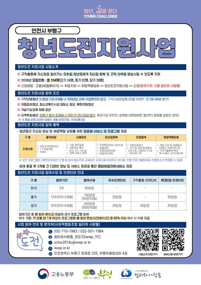 또한 ▲자립준비청년 ▲청소년복지시설 입‧퇴소 청년 ▲북한이탈청년 ▲가습기살균제 피해청년 ▲지역특화청년(부평구 거주 39세 이하)도 참여 대상에 포함된다.