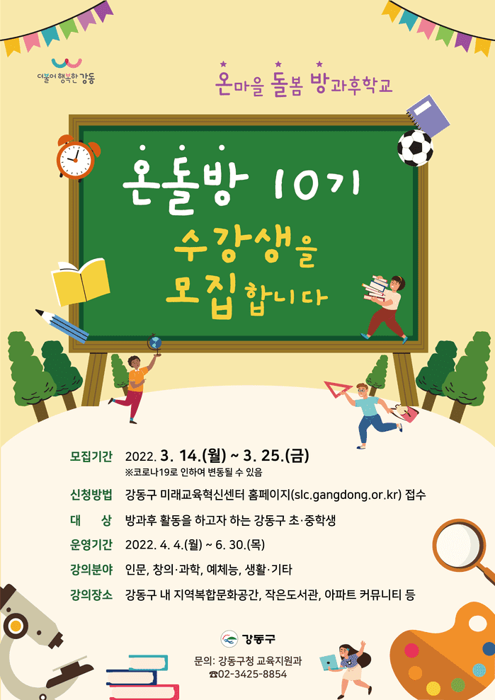 [시민일보 = 이대우 기자] 서울 강동구(구청장 이정훈)가 지역내 거주 중인 초·중학생을 대상으로 진행하는 ‘온마을 돌봄 방과후학교’(이하 온돌방) 10기 수강생을 오는 25일까지 모집한다.