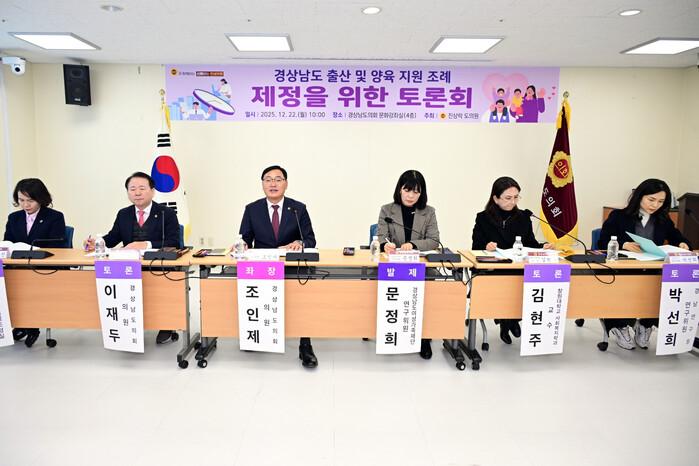 이어 조인제 경상남도의회 의원이 좌장을 맡아 토론회를 진행했으며, 이재두 경상남도의회 의원, 김현주 창원대학교 사회복지학과 교수, 안수진 경상남도 인구정책담당관, 박선희 경남연구원 연구위원이 토론자로 참여했다.