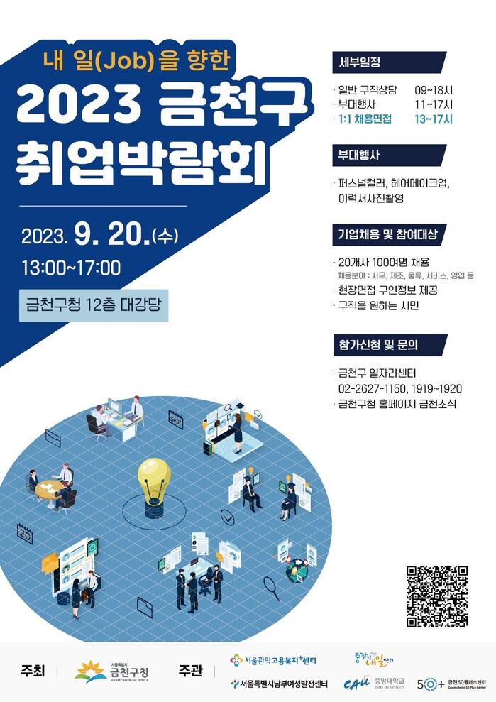 [시민일보 = 여영준 기자] 금천구(구청장 유성훈)는 오는 9월20일 우수한 직원을 채용하려는 기업과 양질의 일자리를 찾고 있는 구직자를 위해 ‘내 일(Job)을 향한 2023 금천구 취업박람회’를 개최한다고 28일 밝혔다.