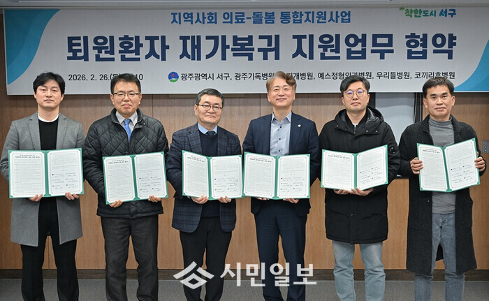 서구는 26일 서구보건소 보건교육장에서 광주기독·무지개·예스정형외과·우리들·코끼리휴병원 등 의료기관 5곳과 ‘퇴원환자 재가복귀 지원을 위한 업무협약’을 체결했다. 이번 협약으로 협력 의료기관은 총 19곳으로 확대됐다.