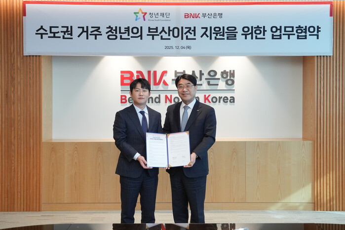 | ▲ 2025년 12월4일, 청년재단과 BNK부산은행이 ‘수도권 거주 청년의 부산이전 지원을 위한 업무협약’을 체결했다.(사진 좌측부터 청년재단 오창석 이사장, BNK부산은행 방성빈 은행장) (사진=청년재단 제공) |