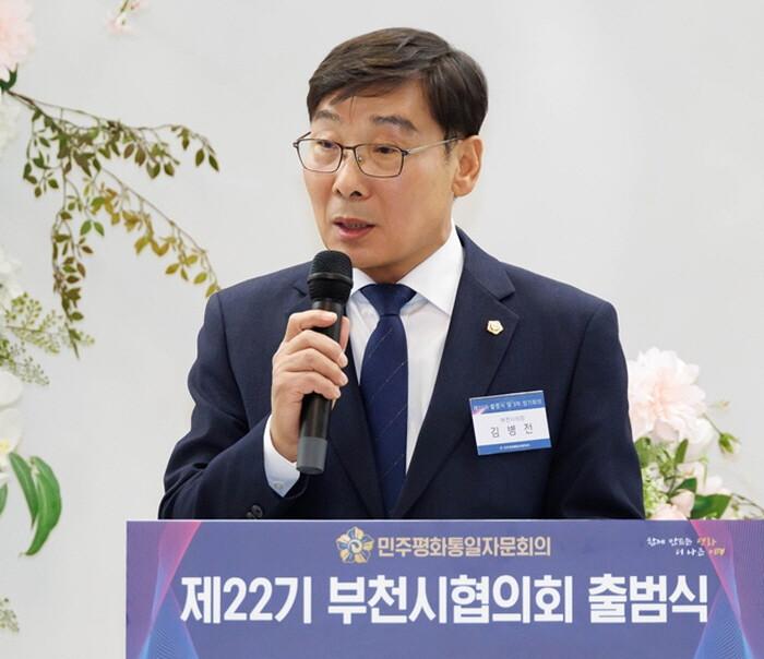 | 김병전 의장이 제22기 민주평화통일자문회의 부천시협의회 출범식에 참석, 축사를 하고 있다. (사진=부천시의회) |