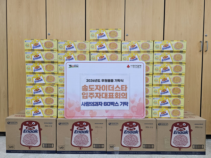 [인천=문찬식 기자] 인천 연수구(구청장 이재호)는 지난 26일 송도자이 더 스타 입주자대표회의(회장 김소희)로부터 지역 내 취약계층 아동을 위한 과자 60상자를 전달받았다.