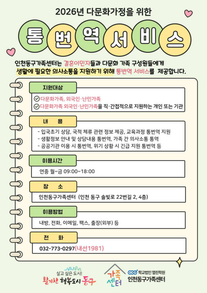 [인천=문찬식 기자] 인천동구가족센터(센터장 박미희)는 결혼이민자의 언어 장벽을 해소하고 안정적인 한국 사회 정착을 돕기 위해 ‘결혼이민자 통·번역 무료서비스’를 운영한다고 밝혔다.