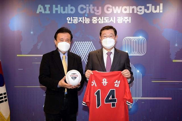김 위원장은 이 시장에게 충장축제 퍼레이드 기념으로 제작한 등번호 14번의 해태타이거즈 유니폼과 선수 사인볼을 전달했다.