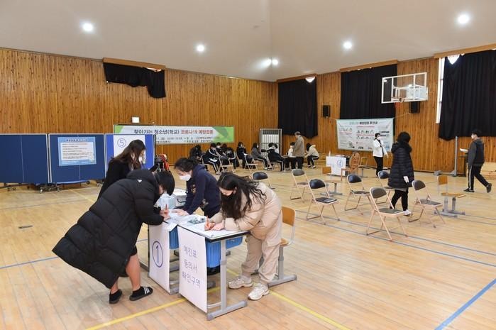 중랑구는 최근 지역내 한 중학교 강당에서 백신접종을 희망하는 학생 60여명을 대상으로 학교로 찾아가는 방문접종을 진행했다. 구는 이달 말까지 방문접종을 지속적으로 안내해 희망 학교를 대상으로 찾아가는 방문접종을 이어갈 예정이다. 사진은 학생들이 코로나19 백신 접종을 받기 위해 모여 있는 모습. (사진제공=중랑구청)