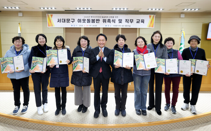 또 ‘2026년 이웃돌봄반 위촉식 및 직무 교육’이 구청 대회의실에서 열렸다. 이웃돌봄반은 명예사회복지공무원의 일원으로서 활동하게 된다.